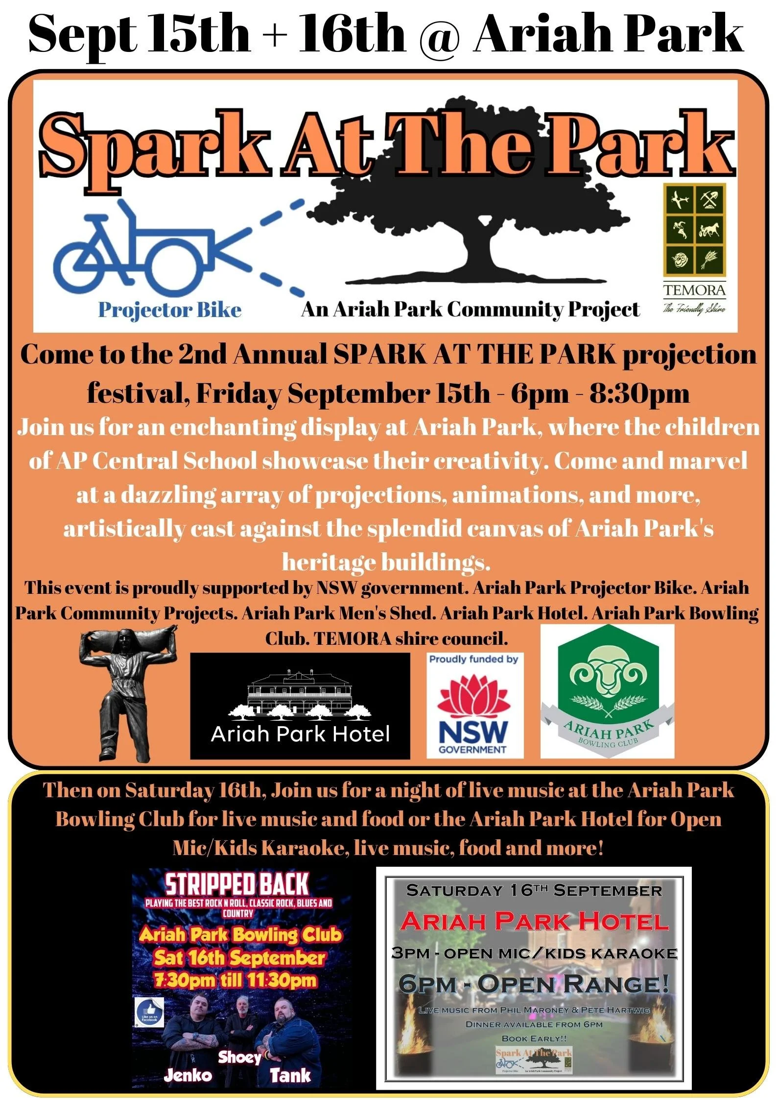 Put the dates in your Diary as it will be a BIG weekend in Ariah Park with the 2nd Annual "Spark at the Park" Light Projection Festival on the 15th & 16th September, 2023.